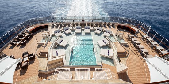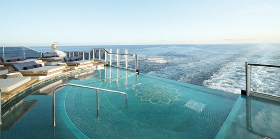 Jedes Deck überrascht mit weitläufigen Bereichen: Der Infinity Pool im hinteren Bereichauf Deck 5 gibt mir wahrlich das Gefühl, ich schwimme in die Unendlichkeit des Meeres hinaus. Auf den Sonnenbetten lässt sich gut die Seele baumeln. Ein paar Decks höher überrascht der Atoll Pool mit einem weiteren Poolbereich und auf Deck 12 befinden sich kleine Geheimplätze wie die seitlichen Whirlpools. Der Helios Pool im vorderen Bereich ist nur für Erwachsene zugänglich.