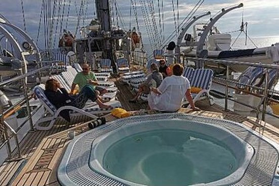 Das Sonnendeck off enbarte sich sofort als regelmässiger Treff punkt für den Austausch derReiseerlebnisse und -erfahrungen. Die Frühaufsteher tranken ihren ersten Kaff ee beiSonnenaufgang an Deck, die Sonnenanbeter bezogen Stellung auf den bequemen Liegenund im Whirlpool. Die Hobby- und Profifotografen unter ihnen jagten nach demperfekten Schnappschuss, beim Setzen der Segel oder bei der Einfahrt in die malerischenHäfen, in denen gleichfalls von den Menschen an Land unser Segler wohl sehnsuchtsvollbewundert und fotografiert wurde.