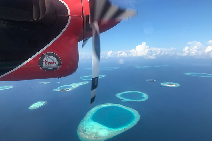 Bereits auf dem Wasserflugzeugtransfer vom Flughafen Male zu unserer ersten Insel breitet sich ein Gefühl von Ferien und Abenteuer in mir aus. Zusammengepfercht mit zwölf weiteren Passagieren sitze ich in der etwas stickigen Kabine der Twin-Otter-Maschine, während wir, begleitet vom sanften Singsang der Triebwerke, in Richtung Süden fliegen. Von oben bestaunen wir das unvergleichliche Inselreich mit seinen leuchtenden Türkis-, Weiss- und Grüntönen. Unser erstes Ziel ist das «LUX South Ari Atoll». Die Insel gehört mit einer Länge von 1800 Metern zu den grösseren Resorts. Der palmengesäumte Strand auf beiden Seiten lädt zu einem ausgedehnten Spaziergang ein, und das vielfältige Angebot an Restaurants sorgt für kulinarische Höhenflüge. Und auch unter Wasser folgen die ersten Höhepunkte.