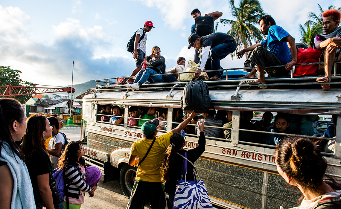 Wir bleiben nur einen Tag in Batangas City und entscheiden uns für die siebenstündige Nachtfähre nach Tablas. Im Schlepptau unsere ganze Familie – dreizehn an der Zahl. Früh morgens tauschen wir die Fähre gegen ein Jeepney – ein typisches Transportmittel, ein Kleinbus. Traditionell waren das Willys-Jeeps, welche die US-Amerikaner nach ihrem Abzug von den Philippinen zurückgelassen hatten und umgebaut wurden. Jeder, der am Wegrand winkt, wird mitgenommen. Ist der Jeepney voll, wird auf dem Dach weitergeladen – und nein, nicht nur Gepäck.