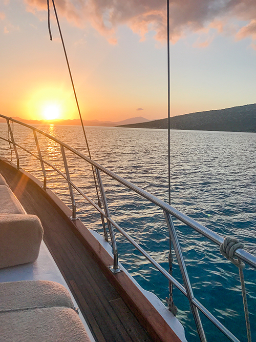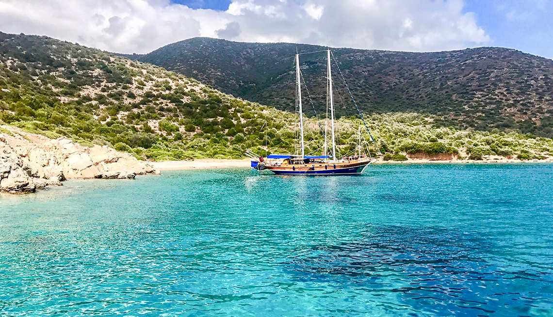 Doch bereits nach der Landung, verschwanden unsere Bedenken schnell. Die Sonne und ein strahlend blauer Himmel hiessen uns willkommen. Nachdem uns unser Transfer an den Hafen von Bodrum gebracht hatte, wurden wir auf unsere Gulet geleitet, wo wir von der Crew, bestehend aus dem Kapitän und dem Koch, mit einem herzlichen «Merhaba» und «Hoş geldiniz» (guten Tag und herzlich willkommen) begrüsst wurden. Nach dem Bezug unserer Kabine, wurden wir noch den restlichen Gästen auf dem Boot vorgestellt. Sogleich hiess es «Leinen los» und unser Turn entlang der türkischen Küste konnte starten.