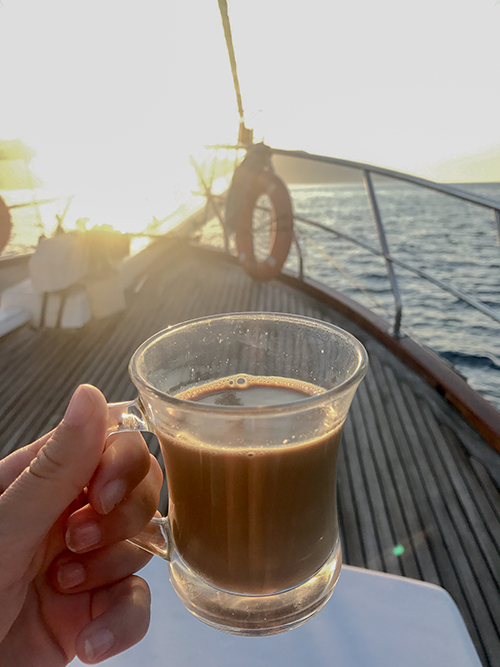 Die Crew an Bord kümmerte sich liebevoll um uns. Sei es für Stefanie (die Frühaufsteherin von uns beiden) einen Kaffee bei Sonnenaufgang zuzubereiten oder täglich einen «Zvieri» bestehend aus einem typischen Cay (türkischer Schwarztee) und Gebäck, bereitzustellen. Ebenfalls war das Essen sehr abwechslungsreich und frisch.