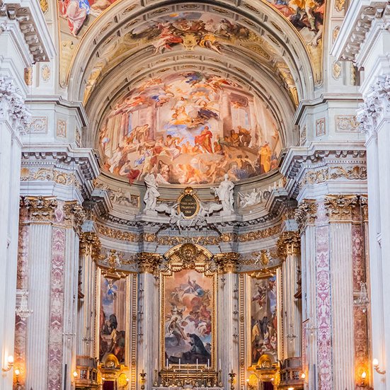 Die Kirche des heiligen Ignatius von Loyola macht auf unvergessliche Art verständlich, warum es sich in Rom lohnt, in jede Kirche zumindest einen Blick zu werfen. Die Fresken an der Decke überraschen den Besucher mit optischen Täuschungen. Markierungen auf dem Marmorboden helfen, diese zu entschlüsseln.