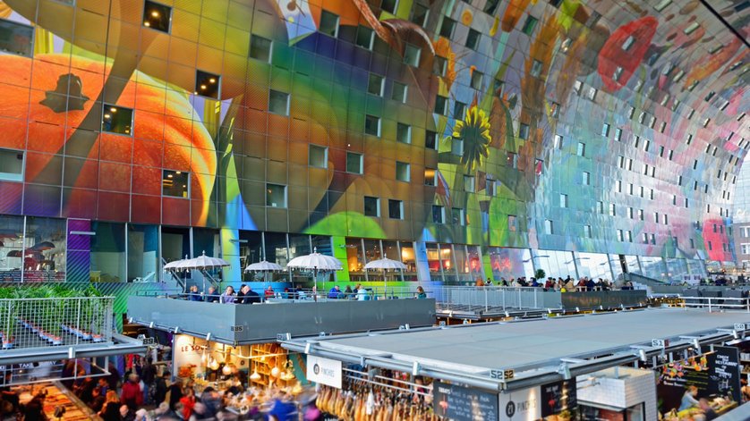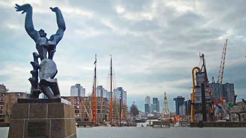 «Es ist wie eine Architektur-Collage», sagt Bolhuis, als wir an der Blaak Station stehen. Da die St. Laurenskirche aus dem Mittelalter, davor eine moderne Einkaufsallee. Neben Piet Bloms Kubuswohnungen ragt «Het Potlood», zu Deutsch der Bleistift, aus dem Boden. Die Bibliothek im Stile des Pariser Center Pompidou mit auffälligen orange-farbenen Rohren gleicht eher einer Raffinerie. Neben dem herkömmlichen Markt steht die neue imposante Markthalle, die im Innern in eine künstliche Welt entführt, in der Blumen und Bienen die Decke zieren. Wo nach dem Bombardement im Zweiten Weltkrieg ausser der Kirche nichts mehr stand, haben sich in den letzten Jahrzehnten Architekten selber verwirklicht. Mit gigantischen Gebäuden übertrumpfen sie sich gegenseitig, auf der Suche nach einem neuen Wahrzeichen. Die Bronze-Skulptur «die zerstörte Stadt» des weissrussisch-französischen Künstlers Zadkine ist gerade mal 6,5 Meter hoch. So klein sie ist, ihre Ausdruckskraft überstrahlt die Wolkenkratzer bei weitem. Da stört es auch nicht, dass sie von anderen Gebäuden umringt und ein bisschen versteckt ist. Im Gegenteil, denn hier ist es endlich windstill.