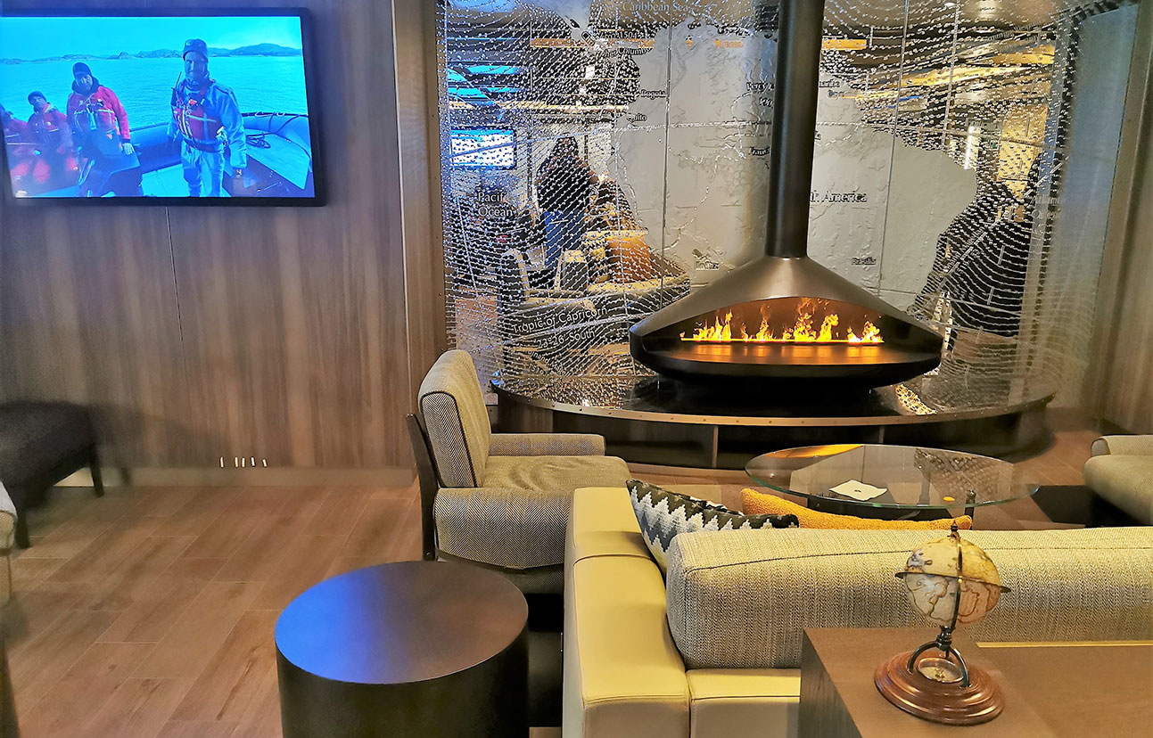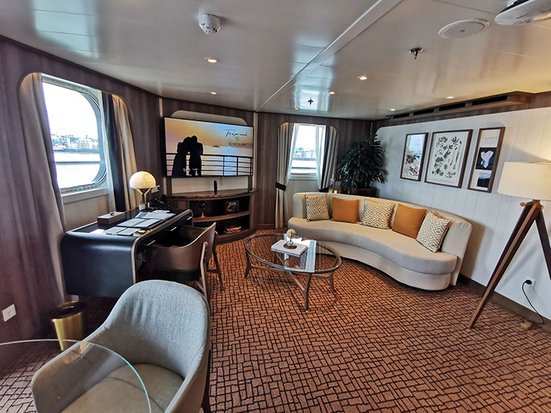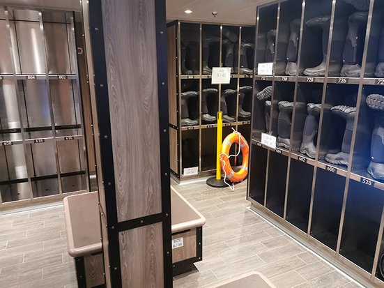Von der Bow Lounge auf Deck 6 vorne kommt man über einen windgeschützten Vorbauauf eine grosse Beobachtungsplattform, die im vorderen Bereich sogar so weit vorragt, dass man direkten Blick auf den Bug des Schiffes hat. Dieser Ausblick ermöglicht fantastische Schnappschüsse, wenn zum Beispiel Delfine mit dem Schiff um die Wette schwimmen. Wem es auf der Aussichtsplattform zu kalt ist, der kann in der warmen BowLounge bei einem heissen Getränk die Livebilder mitverfolgen, um so bei einerTiersichtung rechtzeitig nach draussen zu gehen. Die Bilder werden auch live über die Fernseher in den Suiten übertragen. Sehr praktisch ausgestatt et ist der sogenannte Mud-Room, der Umkleideraum vor den Ein-und Aussteigestellen für die Zodiacs. Hier kann man die Gummistiefel für die Landgängeverstauen und mit einer eigens dafür vorgesehenen Dusche die Stiefel reinigen. Für die Parkas gibt es in jeder Suite einen beheizbaren Schrank, damit man jeden Tag wiederwohlig warm und trocken ins neue Abenteuer geht.