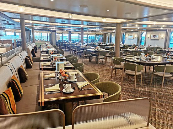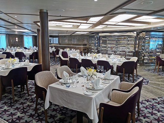 In-Suite Dining ist während 24-Stunden möglich – eine reichhaltige Auswahl an Speisenvon der Menükarte des Hauptrestaurants sind in der Suite bestellbar und werden vomRoom-Service gebracht (und sollte auf alle Fälle einmal ausprobiert werden!). Im Hauptrestaurant gibt es jeden Tag eine à la Carte Menüauswahl bei freier Platzwahlund fl exiblen Essenszeiten. Frühstück, Mitt ag- und Abendessen können hier mit Stil undfreundlicher Bedienung eingenommen werden. All diese verschiedenen Restaurants, Bars und Room-Service Angebote sind bei Seabourngemeinsam mit einer grossen Getränkeauswahl und WLAN inklusive!