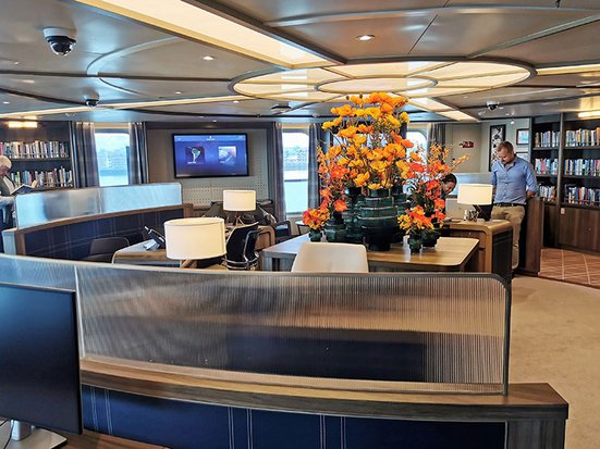 Ansonsten erkennen Seabourn-Gäste viele Orte an Bord wieder: So zum Beispiel den Seabourn Square, an dem sich die Rezeption und eine Kaffee-Bar mit pikanten und süssenSnacks befindet. Hier verbringt man gerne die Zeit an einem Seetag oder um sichzwischendurch bei einem Getränk mit anderen Gästen auszutauschen. Die Glace-Auswahlist hier auch sehr gross und man kann sich einen kleinen Coupe mit den Lieblingssortenzusammenstellen lassen.