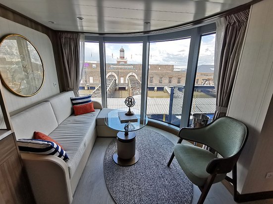 Imposant ist der erste Anblick der Seabourn Venture im Hafen von Tilbury, London. Der eisverstärkte Rumpf der Polarklasse PC6 wirkt mit seinem dunkelgrünen Anstrich und der roten Linie sehr elegant. Man könnte meinen, dass es sich um eine weitere Super-Yacht der amerikanischen Reederei handelt, jedoch ist es das erste Expeditionsschiff der Seabourn-Flotte. Konzipiert, um eine neue Ära in der Expeditionsbranche einzuleiten, hat Seabourn bei diesem Schiff viel Wert auf höchsten Komfort und modernste Technologie gelegt: