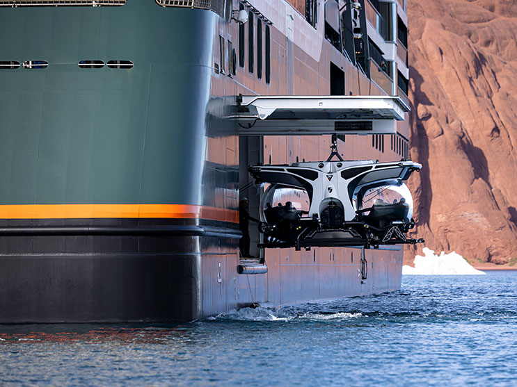Das Expeditionsschiff wurde mit grossen Treibstoff- und Vorratskapazitäten ausgestattet, was eine lange Autonomie ermöglicht und ideal für entlegene Gebiete ist. Dank einer Live‑Navigation können Gäste auch Radar‑, Seekarten- und Wetterdaten einsehen.