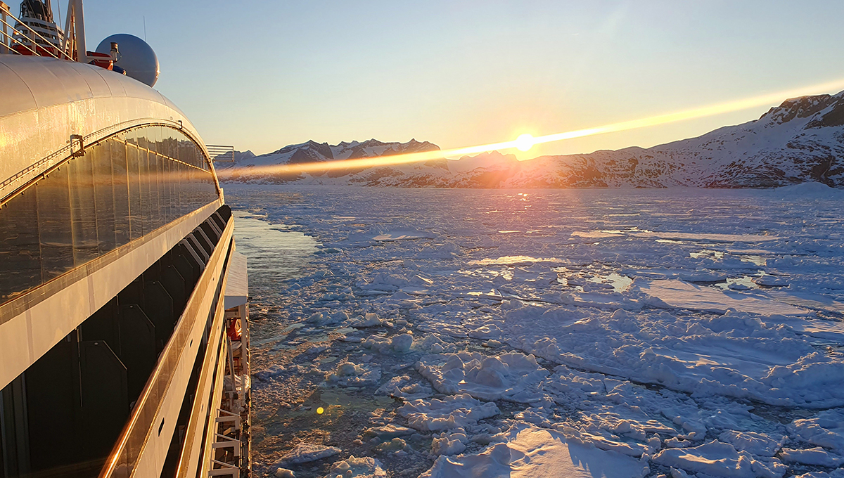 Die Sonne steigt auf und erstrahlt über die endlose Eismasse. Goldfarben reflektiert das Expeditionsschiff «Le Commandant Charcot» die Sonnenstrahlen und liegt absolut lautlos im nördlichen Polarmeer, unweit von der Küste Grönlands entfernt. Zu dieser Jahreszeit findet kein anderes Expeditionsschiff seinen Weg in diese Region. Das schafft nämlich nur ein für diese Konditionen gebauter Passagier-Eisbrecher.