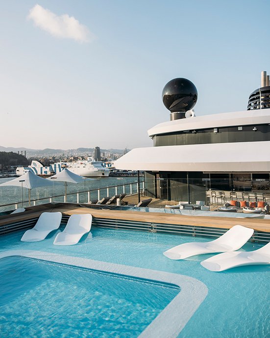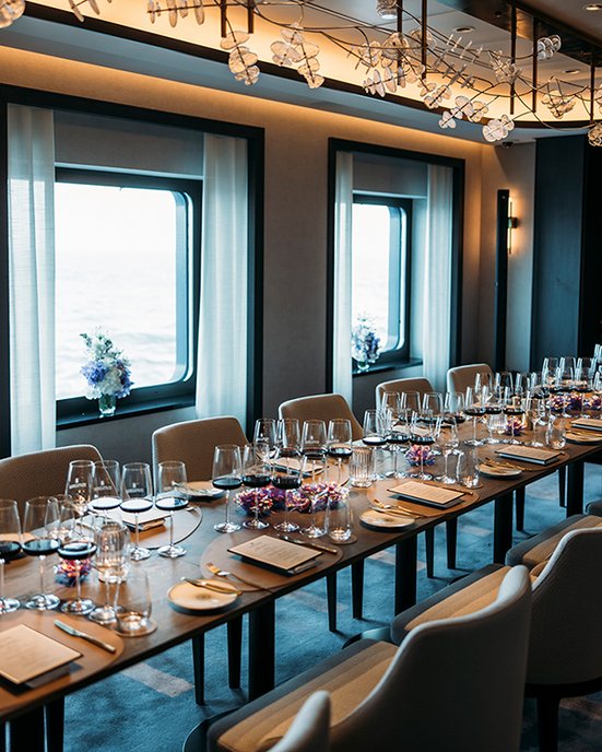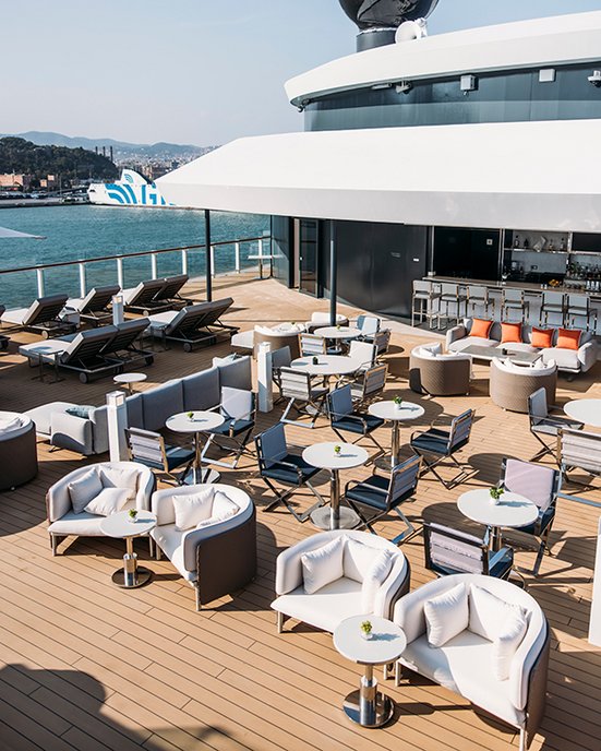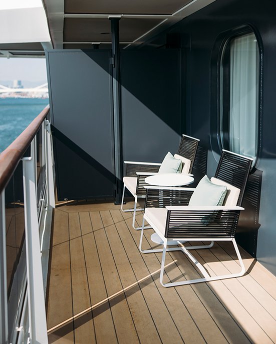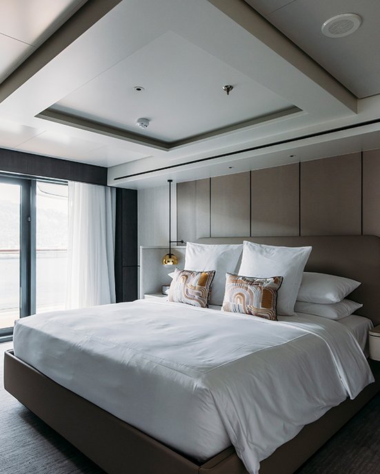 Die kleinsten Suiten starten bei 27m² und verfügen über einen Balkon und eine bequeme Wohn-Sitzecke. In meiner Terrace-Suite erwartet mich zur Begrüssung eine Flasche Champagner. Begeistert bin ich von der Mini-Bar, die mit einer Kaffeemaschine und einem Teekocher von Krups ausgestattet ist. Porzellantassen und eine Auswahl von gekühlten Softdrinks stehen neben feinen Snacks bereit. Im Kleiderschrank finde ich einen Dyson-Föhn, ein Schuhputz-Set im Lederköfferchen und eine bequeme Decke von der italienischen Marke Free (ebenfalls im eleganten Lederkoffer) vor. Kuschelige Bademäntel, Badeslipper und Pflegeprodukte von der Marke Diptyque aus Paris sorgen für erfrischende Momente. Generell erinnert die Ausstattung und der Platz an ein Hotelzimmer, insbesondere im Badbereich. Den grössten Anteil machen die Signature Suiten mit 38m² aus, in den Grand Suites wohnen Sie auf 52m². In den insgesamt 8 Owner-Suiten an Bord befinden sich auf der weitläugen Terrasse jeweils ein privater Outdoor-Whirlpool und eine Aussendusche. Die Concierge-Suiten sind ein paar wenige Quadratmeter kleiner und liegen mittig im hinteren Bereich des Schiffs.
