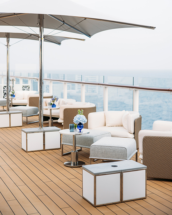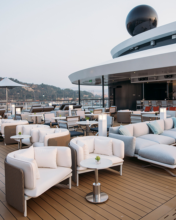 Nachdem ich mich mit meiner Suite bekanntgemacht habe, erkunde ich das Schiff. Meine Wahl für das Mittagessen fällt auf das Beach House. Am Poolbereich wähle ich aus einer Karte, die mit peruanisch inspirierten Snacks und Mahlzeiten echtes Beach House Feeling aufkommen lässt. Für Abkühlung sorgt der Infinity-Pool und in den bequemen Sonnenliegen kann man seinen Träumen nachhängen. Der anschliessende Living Room erstreckt sich über die Hälfte des Decks und bildet das Herzstück des Schiffs. Tagsüber ein gemütlicher Aufenthaltsort mit einem kleinen Café (Kaffee- und Teespezialitäten, Snacks und Süsses) und abends verwandelt er sich in einen Ort für eine Party oder Unterhaltung. Ein bisschen versteckt und vielleicht sogar ein Geheimtipp ist die Observation Terrace auf Deck 9 vorne. Windgeschützt kann man dort in Ruhe einen Cocktail geniessen. Von der Mistral-Bar auf Deck 10 hinten hat man alles im Blick: Die Bugwellen und den Infinity Pool aus der Vogelperspektive. Das Restaurant Mistral wurde zu meinem Lieblingsort für ein entspanntes Frühstück bei geöffneten Glastüren. Die Poolbar und der Poolbereich auf Deck 10 Mitte bilden eine zweite Alternative zum Infinity-Pool auf Deck 5. Somit verteilt sich alles schön je nach Lust und Laune der Gäste.