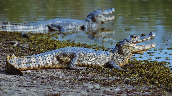 Kurz nach dem vorzüglichen Essen beginnt es heftig zu regnen. Wir ziehen uns unter das Vordach zurück und warten. So stelle ich mir die Regenzeit vor. Warten, während es wie aus Kübeln giesst. Und während wir geduldig das Ende des Regens herbeisehnen, gehen mir nochmals die Bilder von der Nachtexpedition durch den Kopf. Nur vom Mond beleuchtet fuhren wir auf dem pechschwarzen Wasser flussabwärts, mit der Absicht, Kaimane zu finden. Nilson benutzte dafür eine Taschenlampe, mit der er das Ufer ableuchtete. Die Augen der Kaimane reflektieren das Licht und verraten ihren Standort, ohne dass sie uns bemerken würden. Und tatsächlich, da funkelte was in der Dunkelheit. Ohne Motor näherten wir uns an und Nilson lehnte sich mit ausgestrecktem Arm kopfüber vom Bug des Bootes. Dann gings blitzschnell: kurz bevor wir an Land aufliefen packte er mit blosser Hand einen jungen Kaiman am Hals und zeigte ihn in der sichtlich beeindruckten Gruppe. Nicht schlecht!