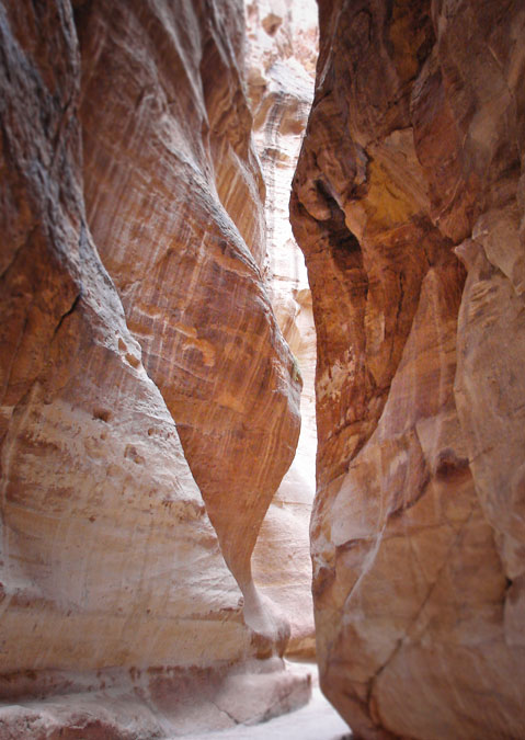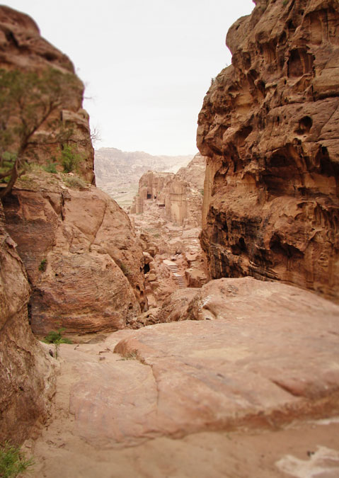 Als ich mich am frühen Morgen vom Vorort in die Felsenstadt aufmache, ist es bitterkalt. Graupel fällt, meine Finger sind so klamm, dass ich kaum meine Kamera bedienen kann, ein bissiger Wind dringt in jede Ritze — und wieder verschleiere ich mich, gegen die Kälte. Nach einem eisigen Spaziergang durch das enge Tal, zwischen hohen geschwungenen Felswänden, erreiche ich sie: die Stadt in Stein, Sehnsuchtsort meiner Kindheit — Petra.