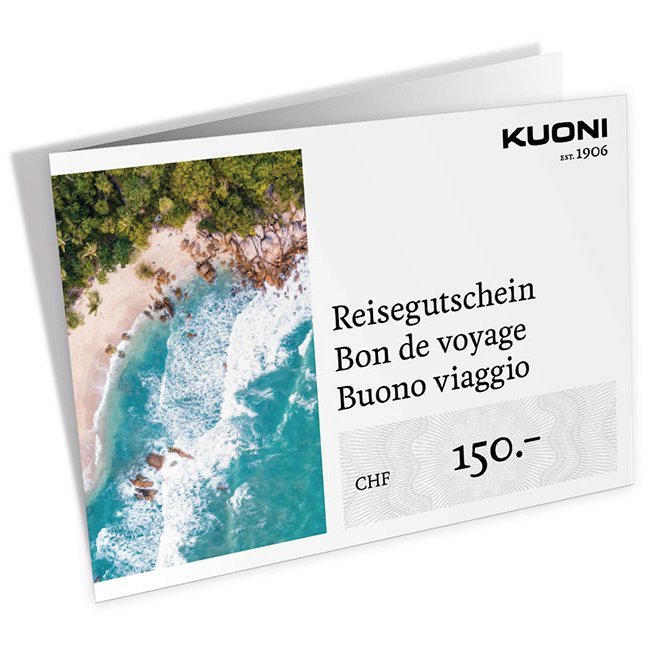 *Der Mindestgutscheinwert beträgt CHF 50.-. Der Gutschein ist in allen Kuoni-, Helvetic Tours- und Rewi Reisen-Filialen in der ganzen Schweiz einlösbar. Barauszahlung, Umtausch sowie eine nachträgliche Einlösung auf bereits gebuchte Reisen sind ausgeschlossen.