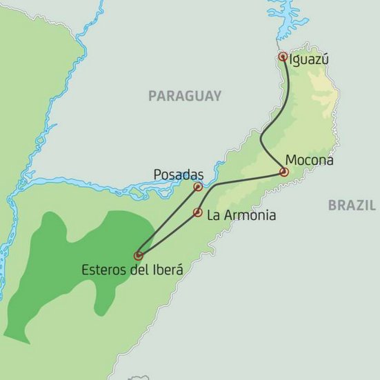Eine abwechslungsreiche Fahrt führt Sie zu den abgelegenen Mocona-Fällen. Unterwegs können Sie eine Edelsteinmine, eine Orchideen-Zucht oder eine Yerba Mate-Genossenschaft besichtigen. Die letzte Teilstrecke führt auf einer holprigen Urwaldstrasse mit spektakulären Aussichten nach Mocona.