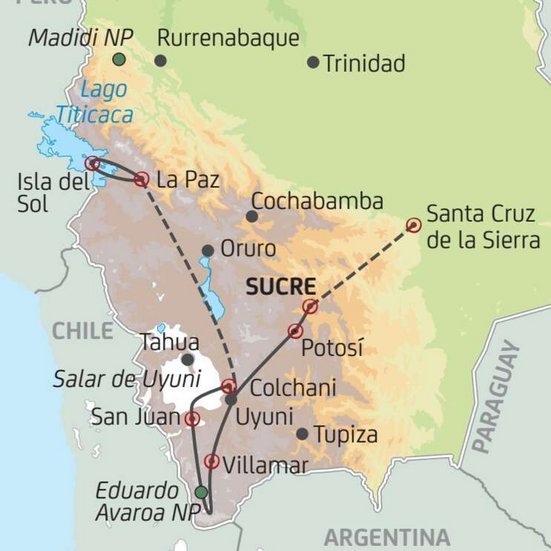 Frühmorgens Flug nach La Paz. Von hier geht es in einer ca. vierstündigen Fahrt nach Copacabana weiter, einem wichtigen Wallfahrtsort am Ufer des Titicaca-Sees. Nach dem Besuch der Kirche mit der berühmten schwarzen Madonna erfolgt die Bootsfahrt zur Sonneninsel. Typisches Mittagessen am Seeufer und ca. einstündige Wanderung zu Ihrer Unterkunft, welche hoch über dem Titicaca-See thront, und eine fantastische Aussicht bietet. Der nächste Tag steht Ihnen zur freien Verfügung.