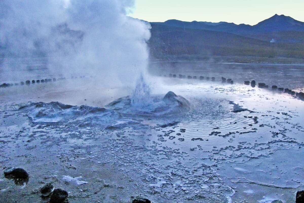 Sehr früh werden Sie im Hotel abgeholt und nehmen an einem geführten Ausflug zu den höchstgelegenen Geysiren der Welt teil. Auf 4.280 m Höhe, östlich der Atacama Wüste liegen sie - die El Tatio Geysire. Der Anblick wird Sie beeindrucken, wenn die imposanten Dampffontänen aus dem Boden emporsteigen. Von 110 eruptierenden Quellen wurden über 80 als echte Geysire identifiziert, von denen über 30 andauernd aktiv sind. Die Wassertemperatur liegt bei ca. 86 °C. Es handelt sich um das größte Geysirfeld der Südhalbkugel und das drittgrößte der Welt. Hier gibt es auch ein Badebecken für Besucher, in dem kaltes und warmes Wasser zusammenfließt. Ca. 95 km (F)