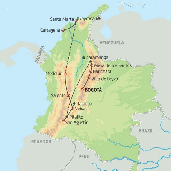 Kaffee, Kultur und Karibik charakterisieren diese Reise durch Kolumbien. Kaum ein Land ist so abwechslungsreich wie dieses. Erleben Sie es selbst und Sie werden mit einer atemberaubenden Reise durch ein grossartiges Land belohnt: kunstvoll, kunterbunt, kulinarisch, kulturell, kokett – komplett! Ein weiteres Plus ist die Bevölkerung Kolumbiens, welche sich durch Gastfreundschaft und Hilfsbereitschaft auszeichnet.